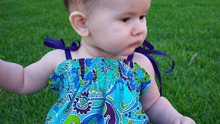 So all day almost yesterday, I sewed, and sewed, and sewed to finish most of Mikinlees summer wardrobe. Here are the pics we took out back at Bre's apartment. The grass was soo nice there I can't wait to take more pictures of her there!!